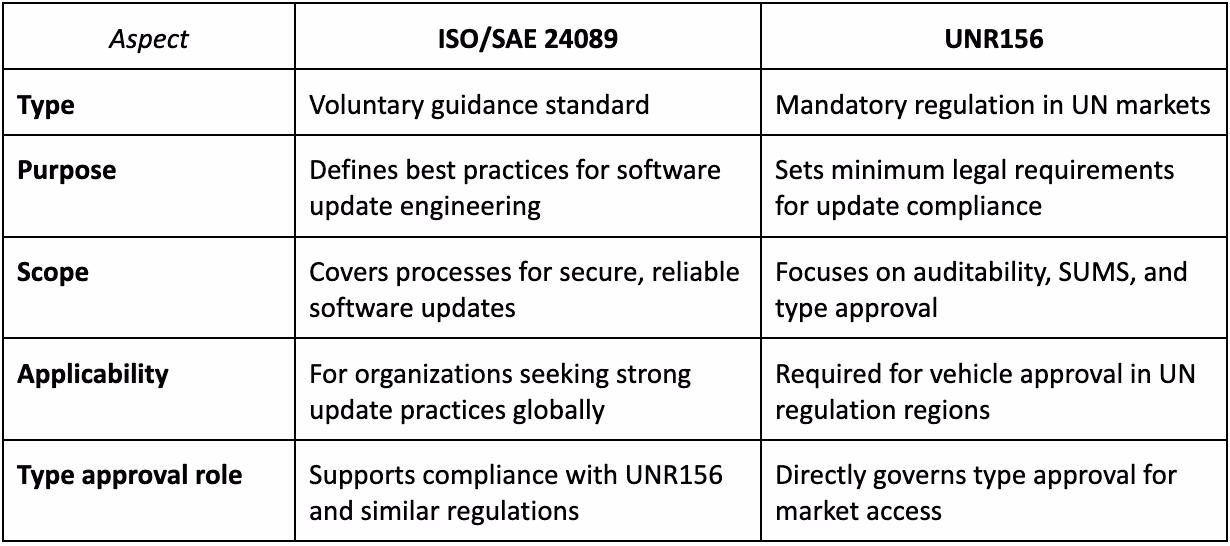 ISO/SAE 24089 and UNR156 address the same goal – secure, reliable automotive software updates – but differ in purpose and application. While UNR156 sets legal requirements for type approval, ISO/SAE 24089 provides best practices to help meet these obligations. Both are essential for teams building compliant and resilient update processes.