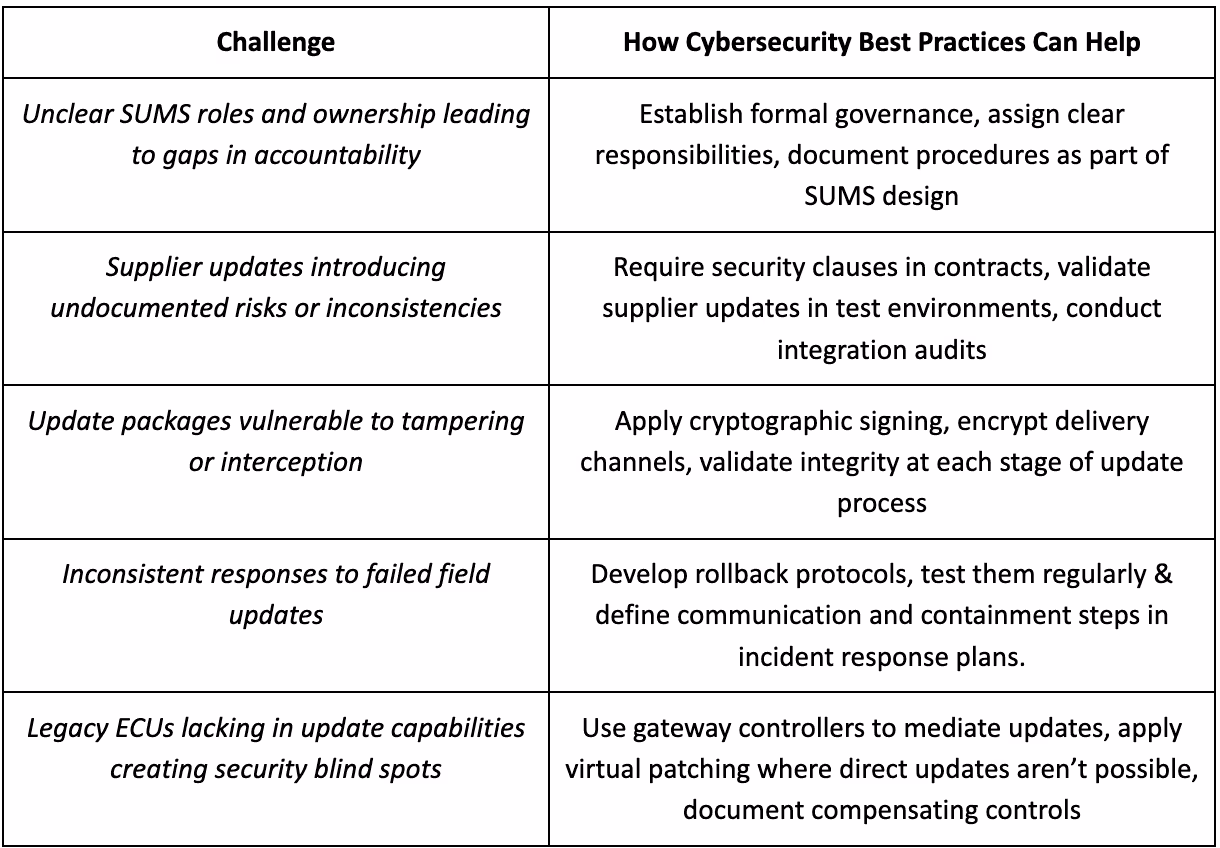 Cybersecurity teams managing automotive software updates face a range of technical, operational, and organizational challenges. These obstacles can complicate compliance with standards like ISO/SAE 24089 and UNR156, and increase risk if left unaddressed. The table below illustrates how well-aligned cybersecurity best practices can help overcome each key challenge in a structured, effective way.
