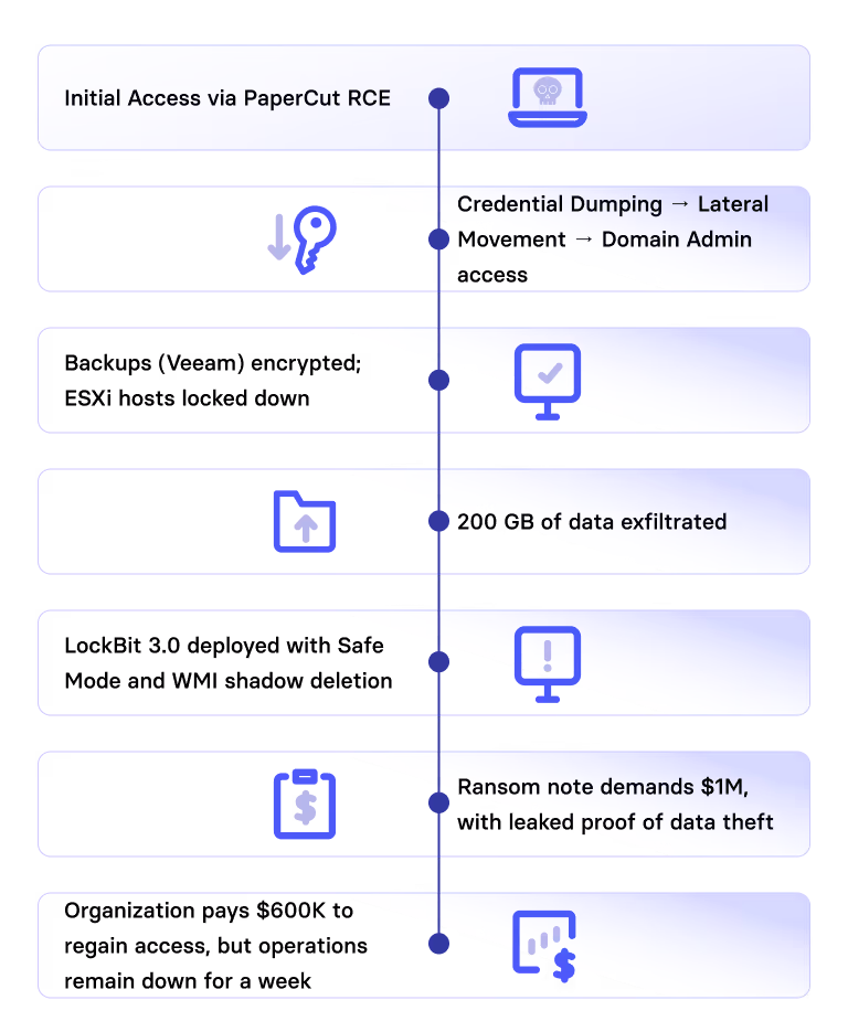 A mid-sized enterprise running an outdated PaperCut server (CVE-2023-27350) was breached in early 2025: