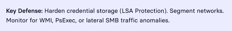 - Credential Dumping → Lateral Movement → Domain Admin access