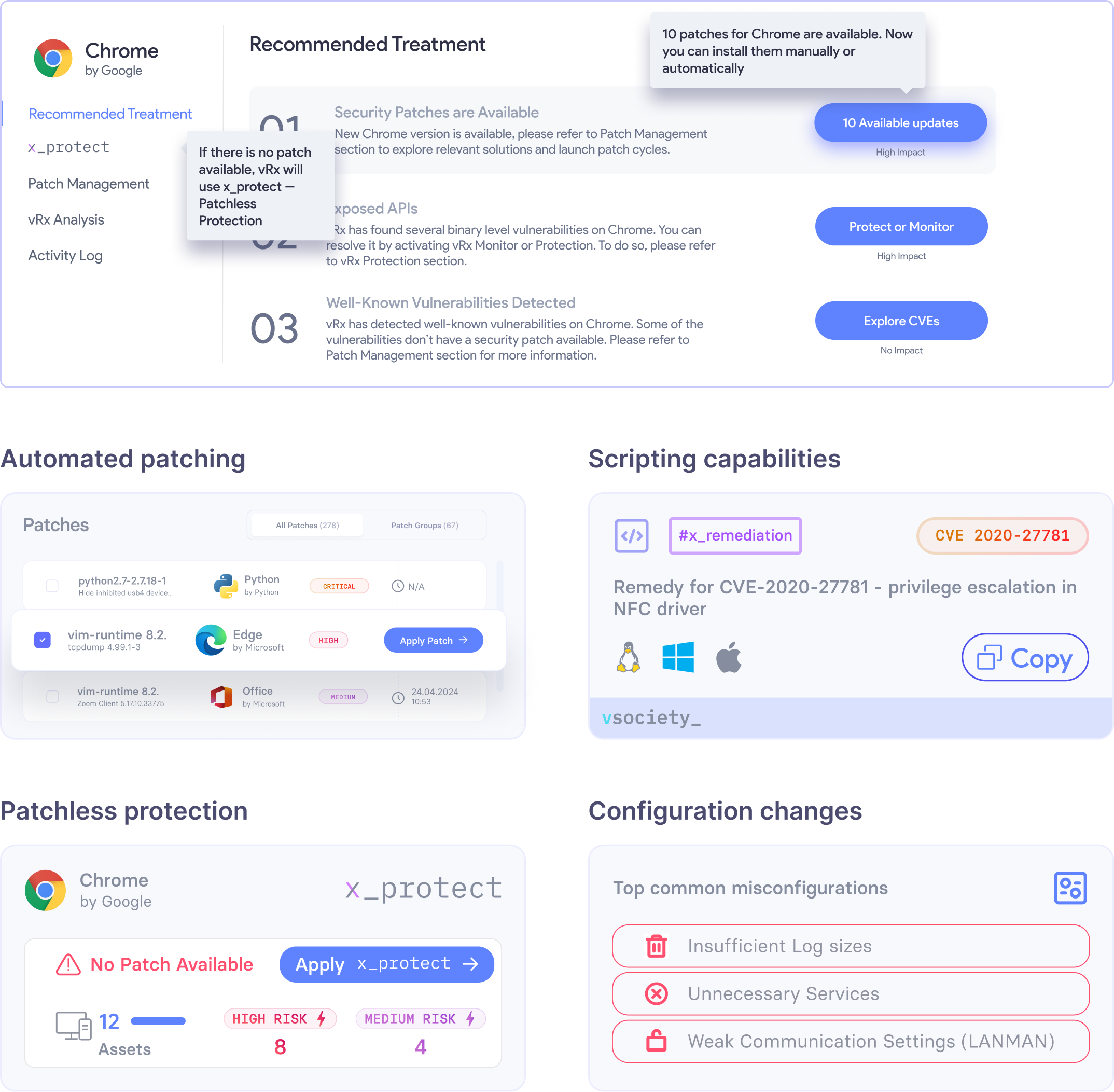 Scripting capabilities address vulnerabilities requiring more than a simple patch. Some fixes involve registry changes, configuration modifications, or targeted remediation of specific components. vRx provides verified scripts and custom scripting for complex scenarios.