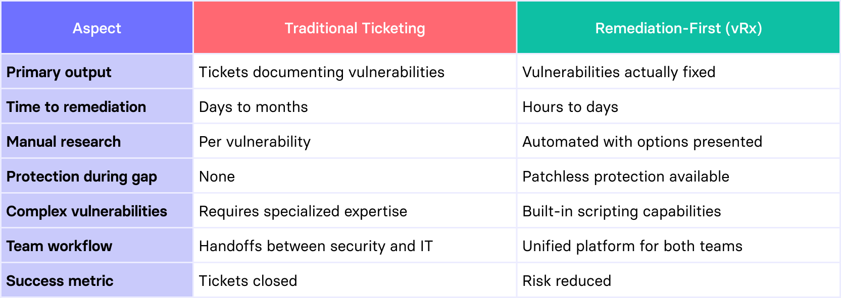 Modern environments overwhelm IT teams with vulnerability tickets, burying critical risks in backlogs. Context is lost as issues move from security to operations, while manual research slows remediation. Tickets track work completed and not risk reduced. This leaves critical assets exposed. And until fixes are deployed, systems remain vulnerable with no protection in place.