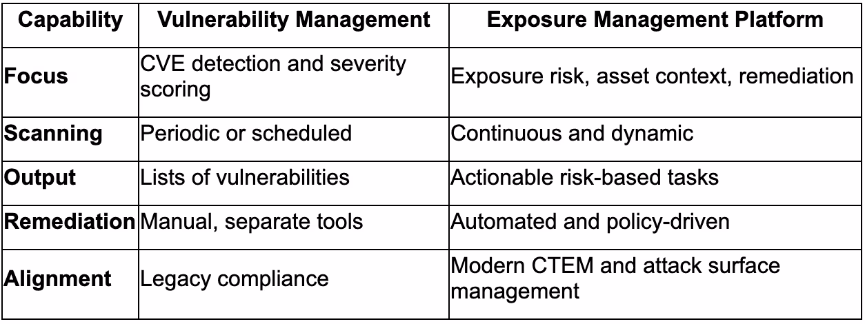 A: An exposure management platform continuously discovers, prioritizes, and remediates risk, while a vulnerability scanner only detects known issues.