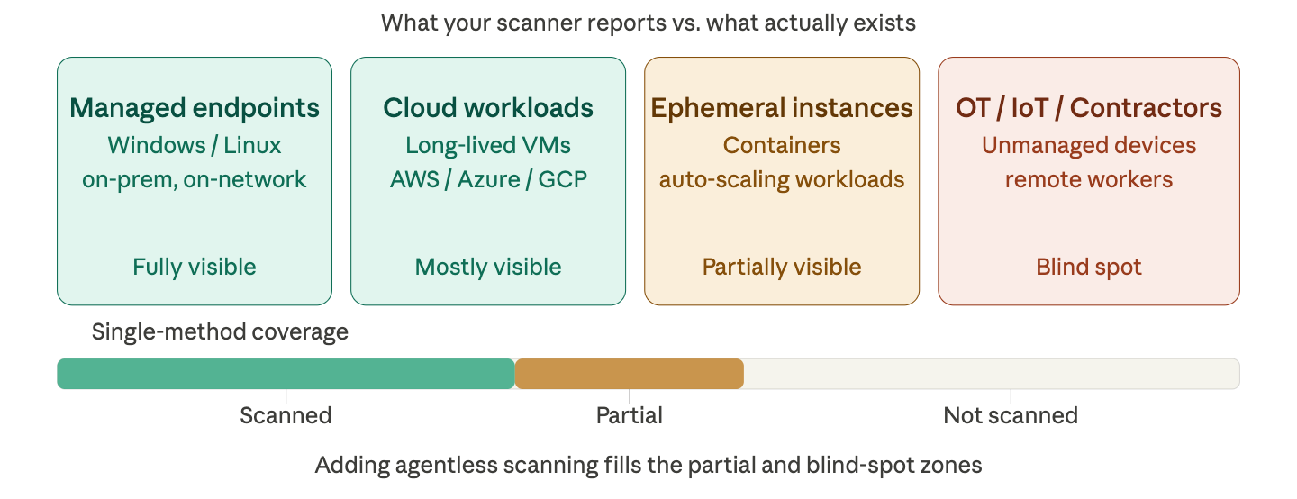 This is not a vendor pitch. It is a structural problem that follows from how each scanning approach works. Agent-based scanning provides deep, continuous visibility into every managed system where an agent is deployed. Agentless scanning provides broad, fast coverage across everything reachable on the network or via cloud APIs. Neither is a superset of the other. The assets each method misses are different and often the most dangerous ones.