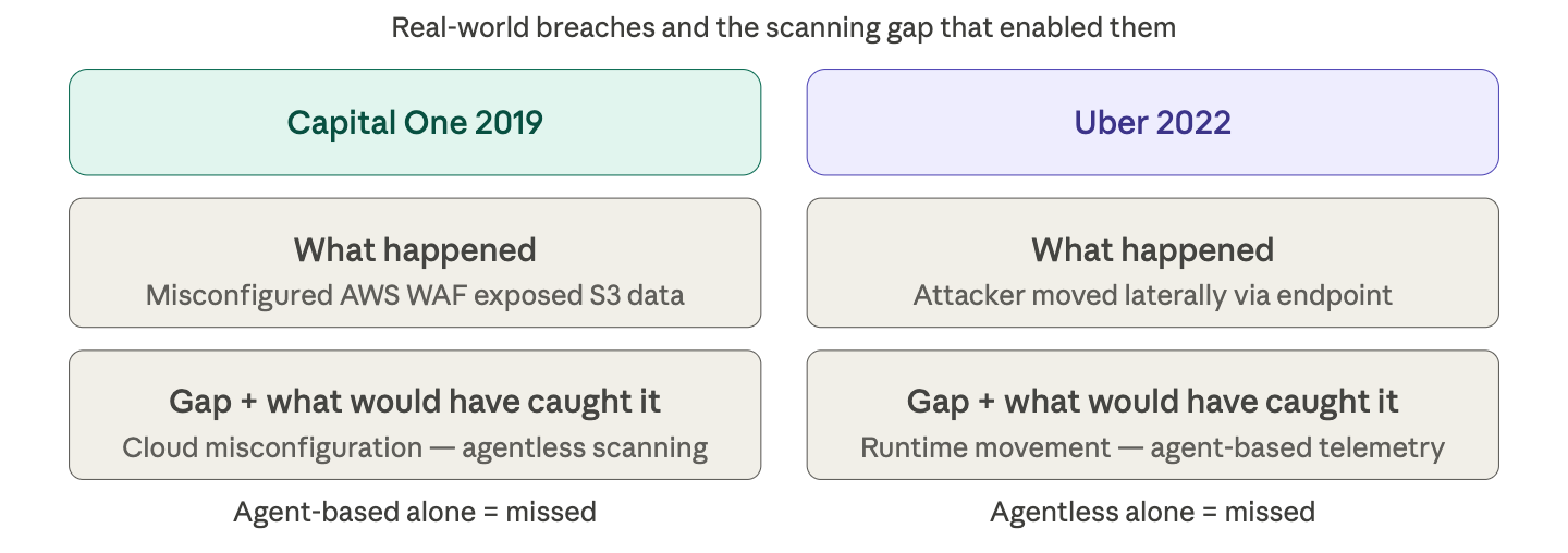 Neither gap is theoretical. In Capital One's 2019 breach, a misconfigured AWS WAF exposed S3 data that agentless scanning could have caught pre-breach. In Uber's 2022 breach, runtime telemetry from an agent-based sensor could have caught the lateral movement. The pattern is consistent: different attack types exploit whichever gap the organization left open.