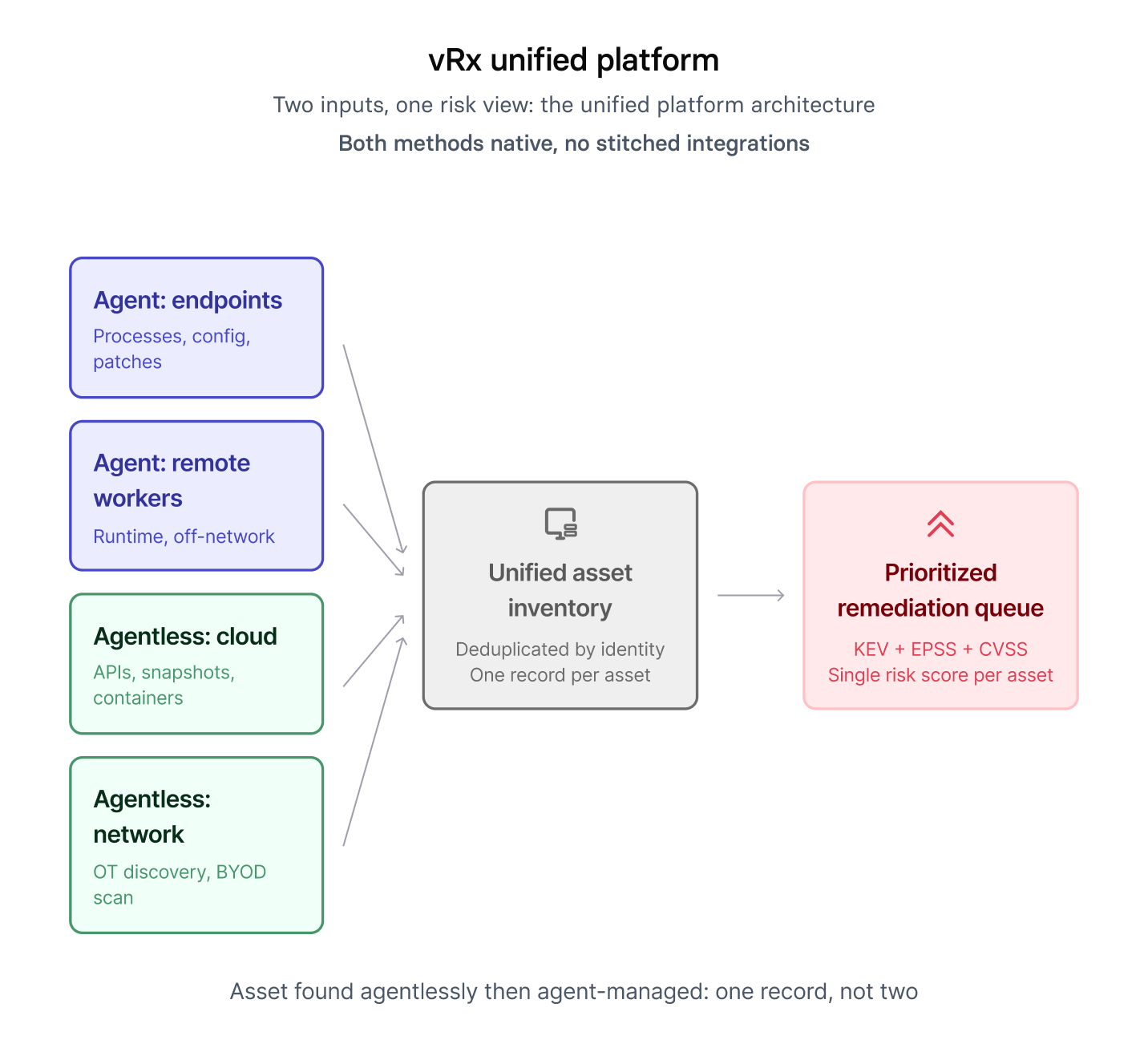 Second, a single risk view. Findings from both methods need to be normalized and prioritized together. A CVSS 9.8 found agentlessly on a cloud workload and a CVSS 9.8 found by an agent on a managed server should appear in the same remediation queue, with the same prioritization logic applied.