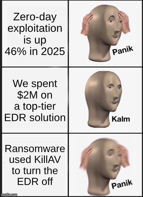 The cybersecurity industry has spent the last decade investing heavily in detection and response technologies. While these tools are vital, the H1 2025 landscape demonstrates their limitations. We are seeing a rising trend of “EDR Killers” and aggressive defense evasion techniques, such as Bring Your Own Vulnerable Driver (BYOVD) and the KillAV attacks that enabled infiltration and ransomware campaigns against various sections of network infrastructure and widespread enterprise-level security “solutions” like Symantec antivirus. Sophisticated threat actors are no longer just trying to hide from detection; they are actively dismantling and subverting the tools designed to catch them.
