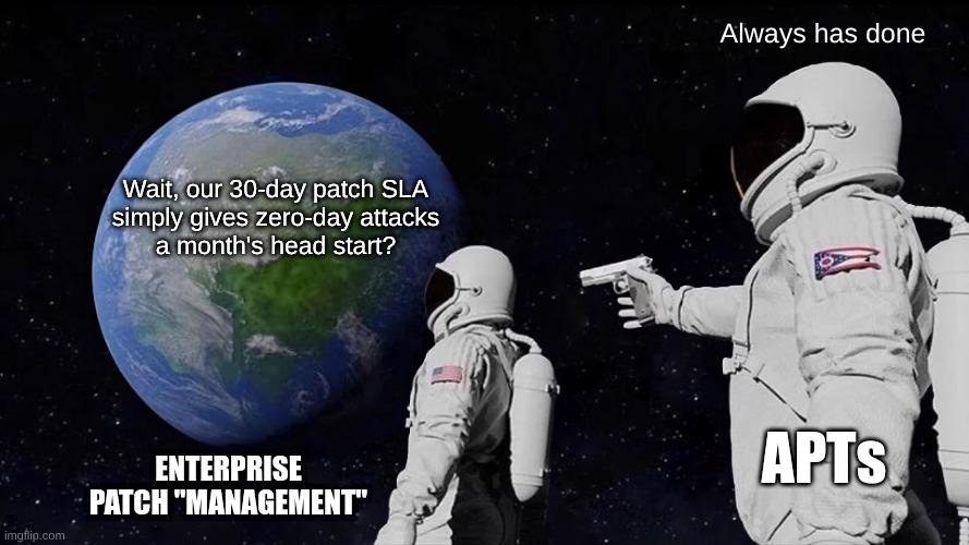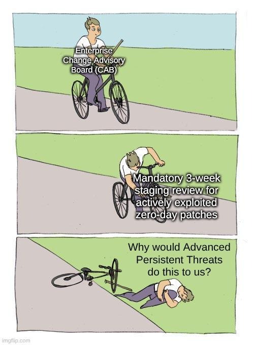 - Bureaucratic testing cycles: Mandatory multi-week testing phases ensure that exploits are weaponized long before patches are approved for production.