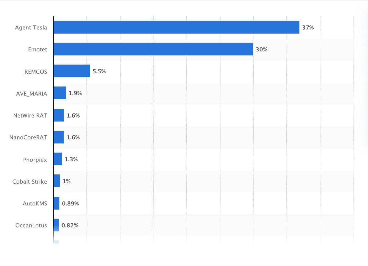 Remote Access Trojans (RATs) have become a significant cybersecurity threat. RATs provide attackers with full access to compromised devices, enabling them to steal data, manipulate systems, and conduct surveillance. Agent Tesla emerged as the most prevalent RAT, responsible for nearly 37 percent of detections.