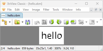 For example, here is the same hello black-and-white picture in the XPM1 format: